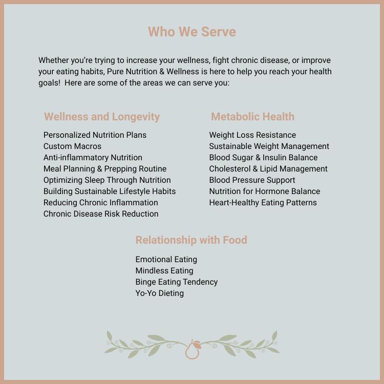 Eating healthy shouldn’t have to feel so complicated. At Pure Nutrition & Wellness, I teach you how to create a healthy and realistic routine that works for your busy life. You’ll discover what to eat for your body AND how to stop overeating and self-sabotaging (no more late night, out of control binges). I’ll coach you through every step so that you can stop spinning your wheels and finally achieve the lasting results you’ve been wanting. From weight management to lowering inflammation and preventing cardiovascular disease, my services have you covered.