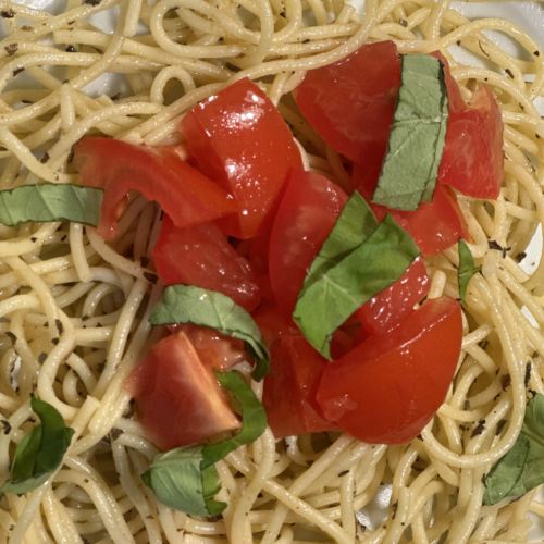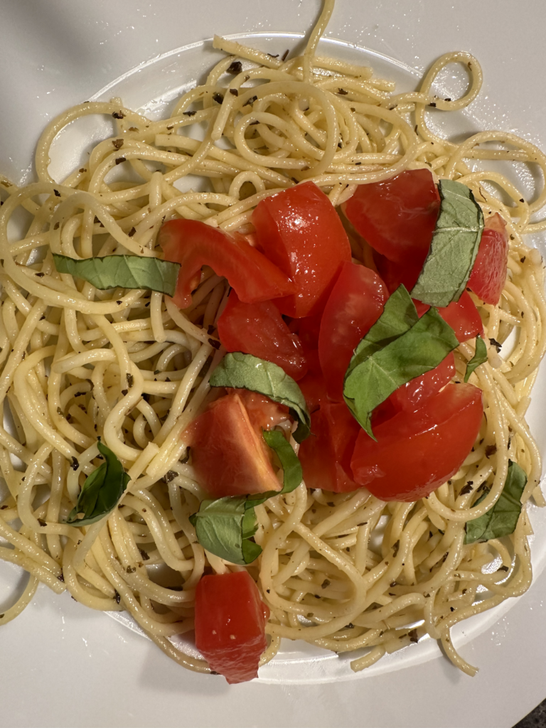 - Plate the pasta and top each plate with chopped fresh tomatoes, fresh basil, and freshly grated Parmesan cheese.
